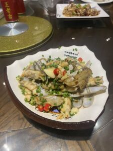 疲れた体を癒す、美味しい料理の数々。特に感動したのは、マテ貝とゲソ! ピリ辛でニンニクの香りが食欲をそそり、プリプリの食感がたまりません。特にマテ貝は浙江省から福建省にかけて非常に良く食べられる名物で、日本人が食べても違和感ゼロなのでオススメです!