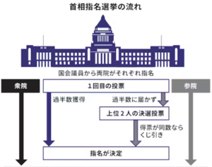 - 衆議院・参議院の両院から各政党の党首に対して投票し、両院にて過半数を占めた候補(政党党首)が内閣総理大臣となる。